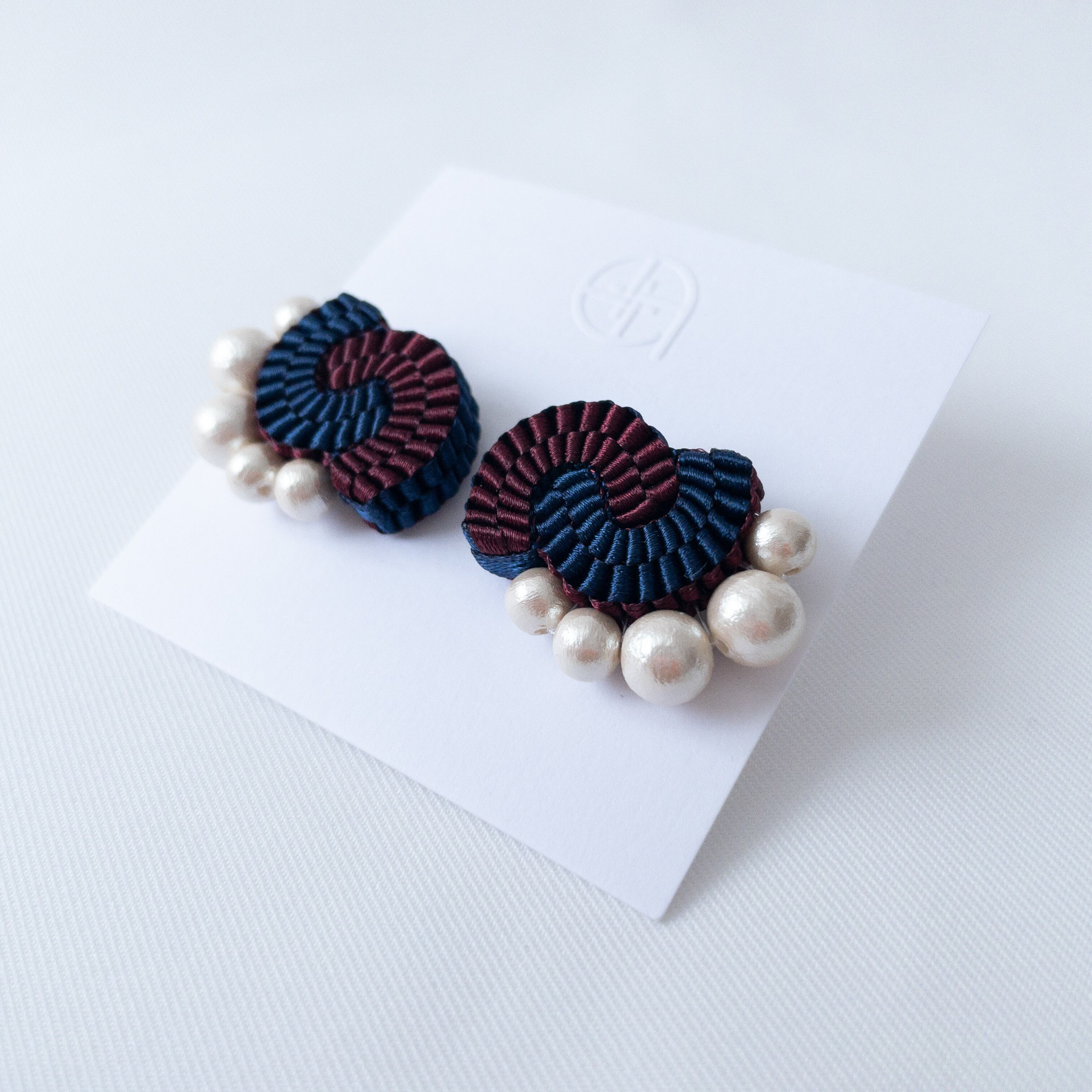 ダブルサテンリボン(ポリエステル)、コットンパール、ナイロンテグス、ポリエステル糸、レジン(裏面)