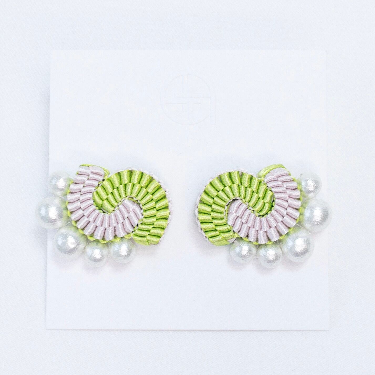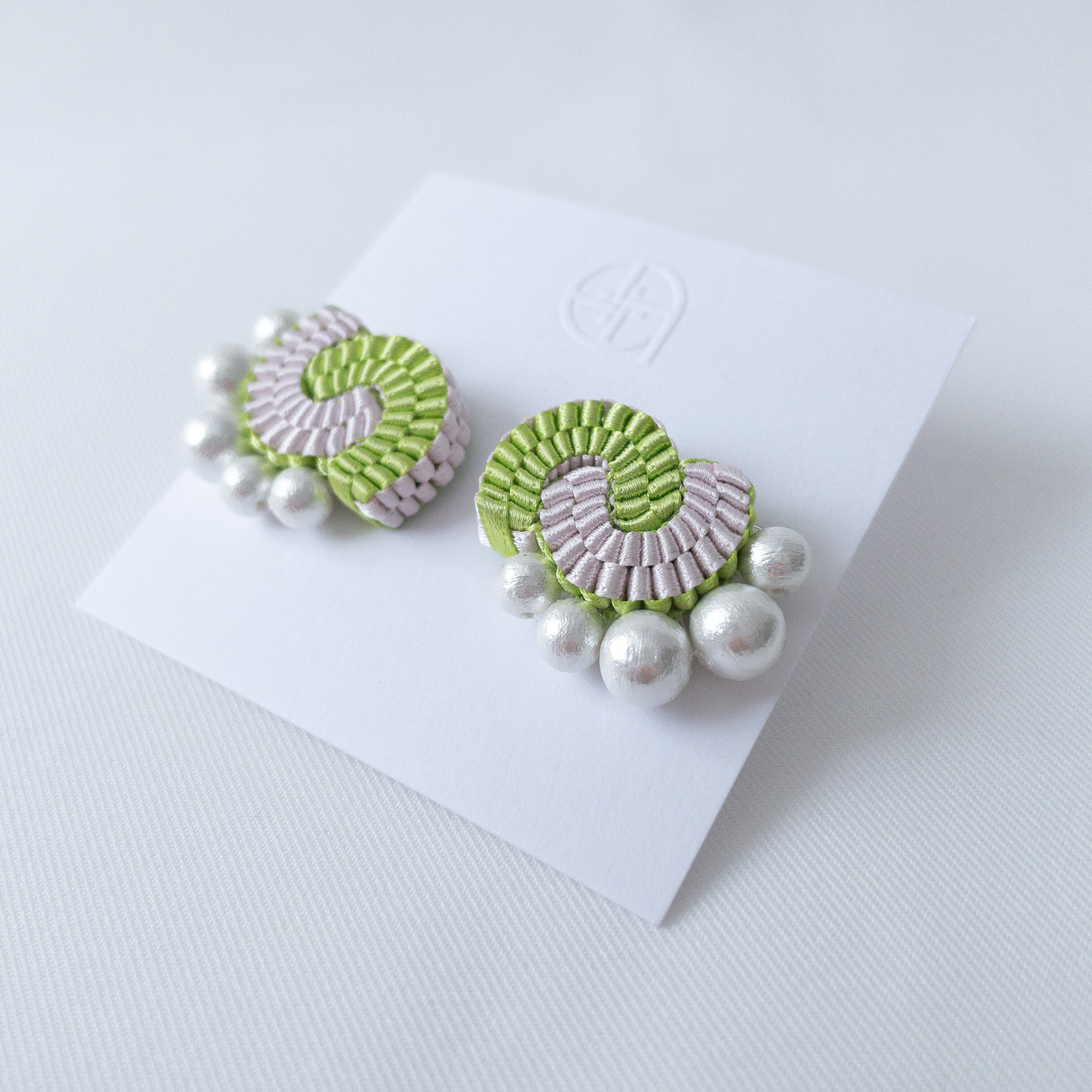 ダブルサテンリボン(ポリエステル)、コットンパール、ナイロンテグス、ポリエステル糸、レジン(裏面)
