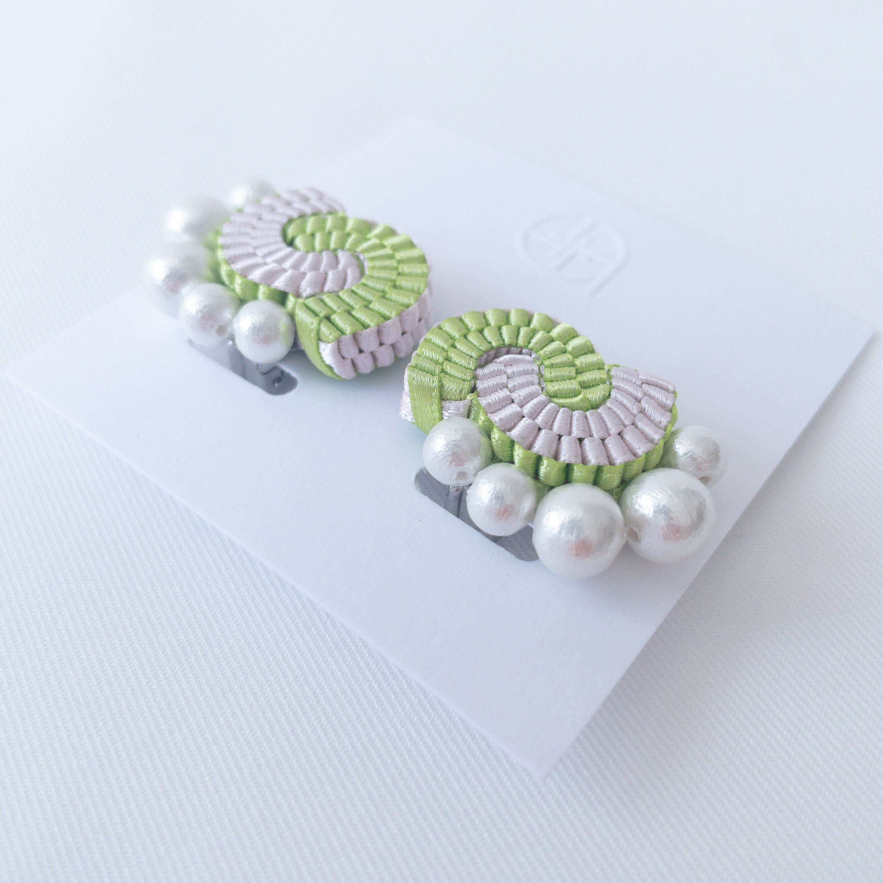 ダブルサテンリボン(ポリエステル)、コットンパール、ナイロンテグス、ポリエステル糸、レジン(裏面)