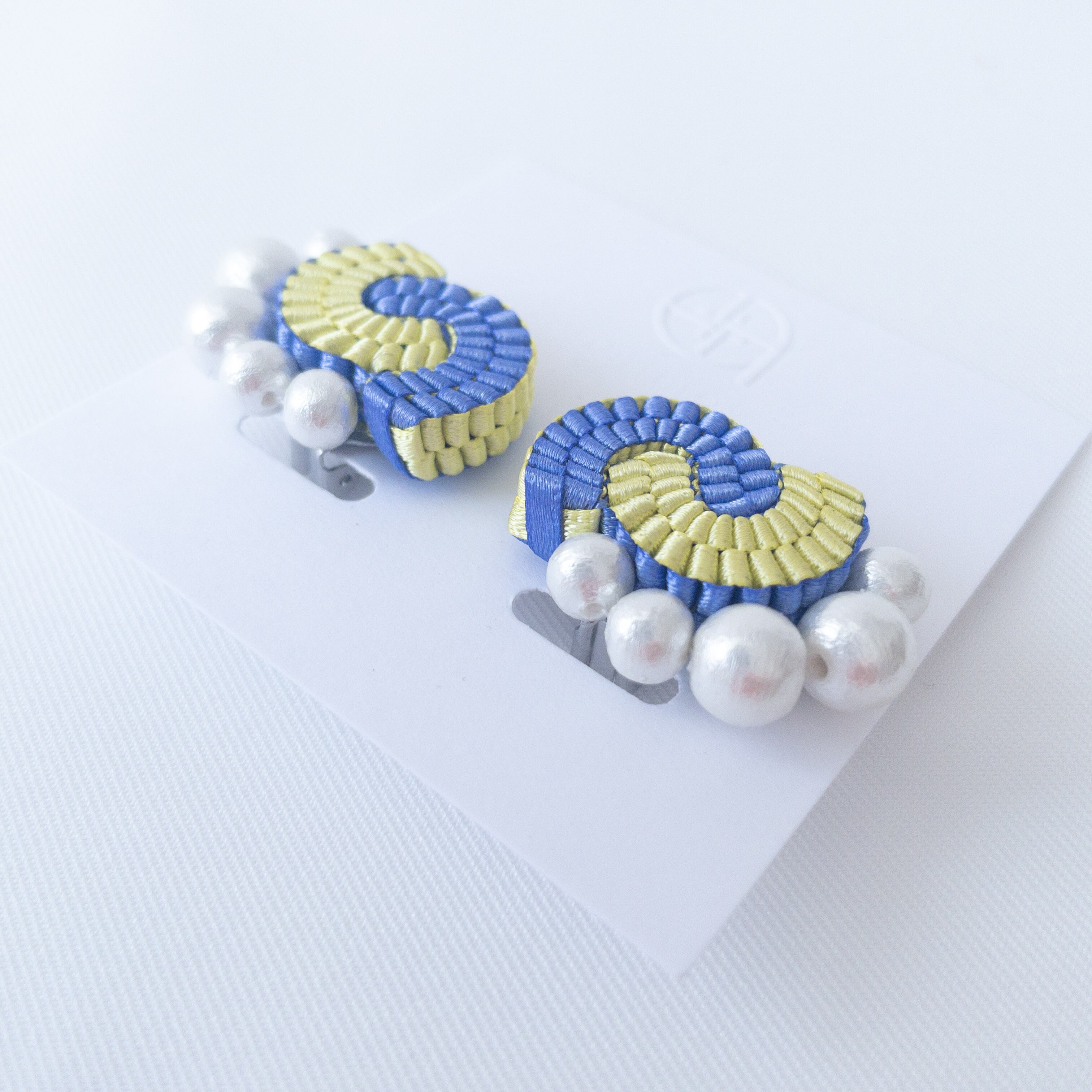 ダブルサテンリボン(ポリエステル)、コットンパール、ナイロンテグス、ポリエステル糸、レジン(裏面)
