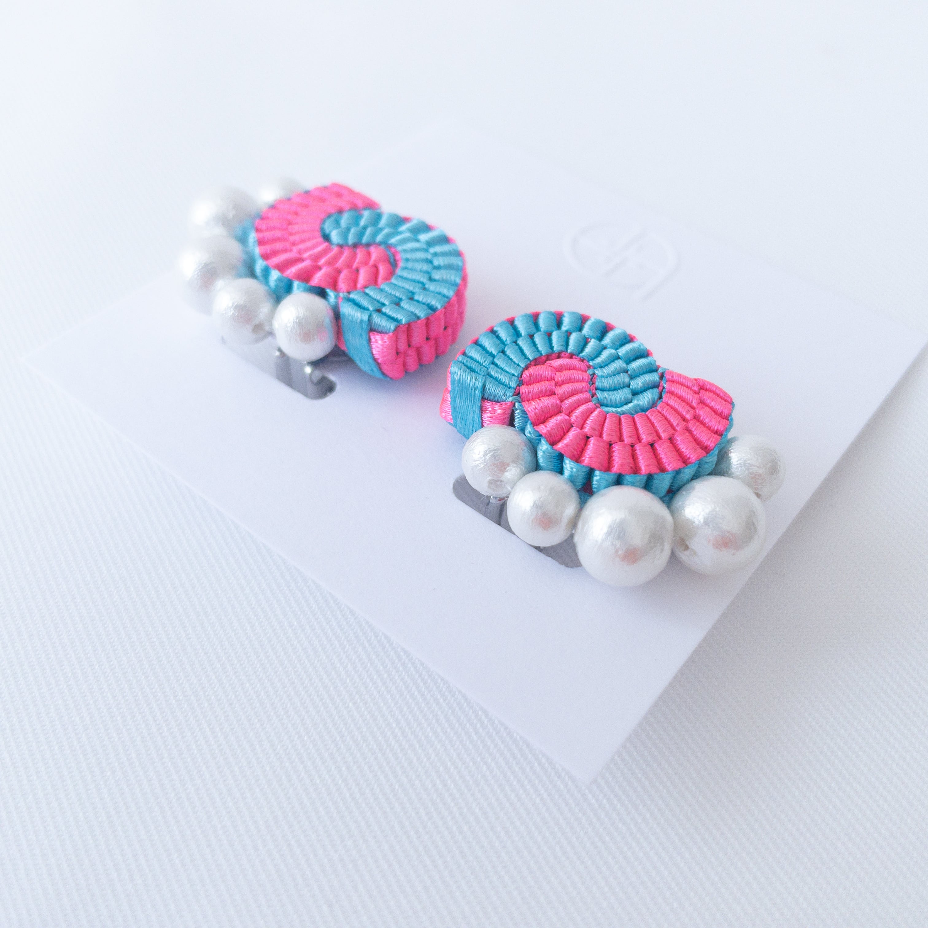 ダブルサテンリボン(ポリエステル)、コットンパール、ナイロンテグス、ポリエステル糸、レジン(裏面)