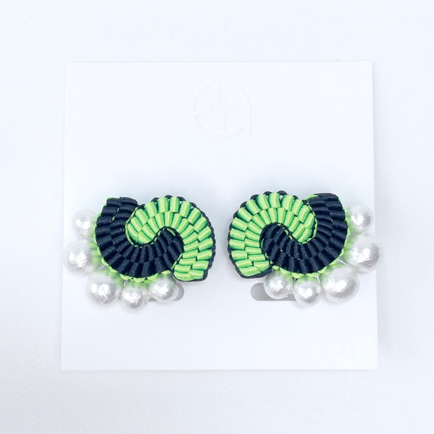 ダブルサテンリボン(ポリエステル)、コットンパール、ナイロンテグス、ポリエステル糸、レジン(裏面)