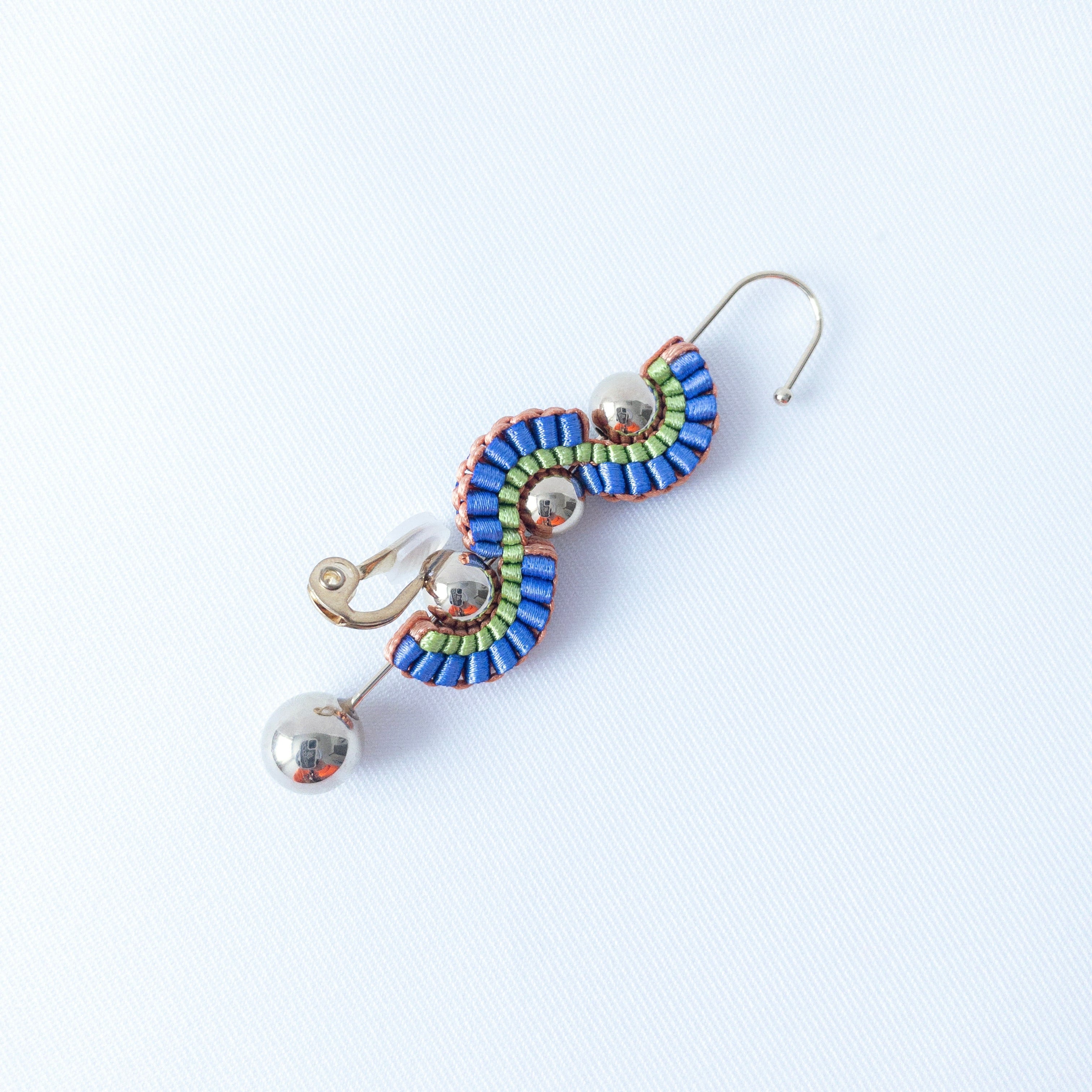 クリップタイプのイヤリングで耳たぶを挟み、耳の上部にフックを引っ掛けて使用します。