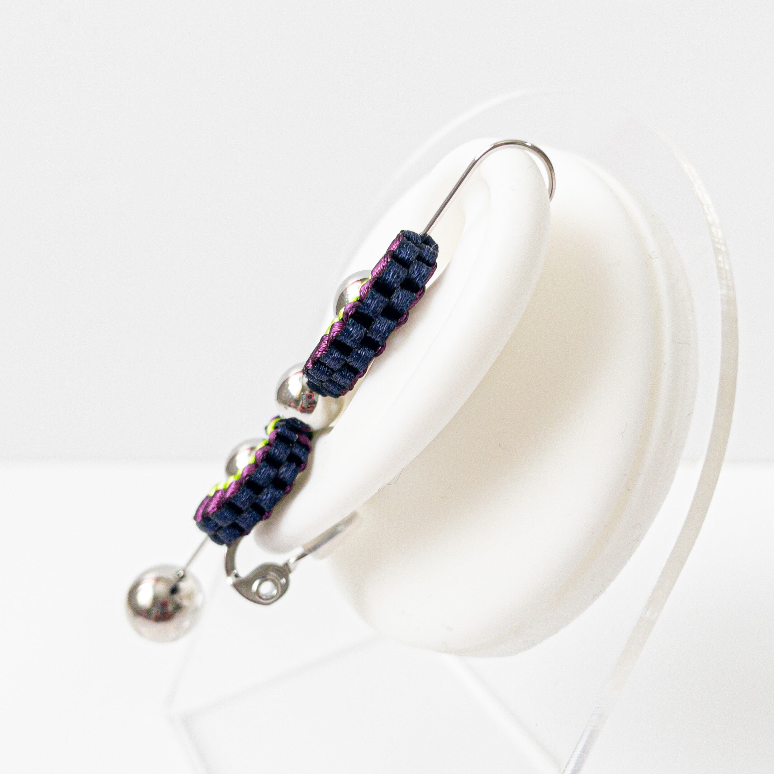 クリップタイプのイヤリングで耳たぶを挟み、耳の上部にフックを引っ掛けて使用します。