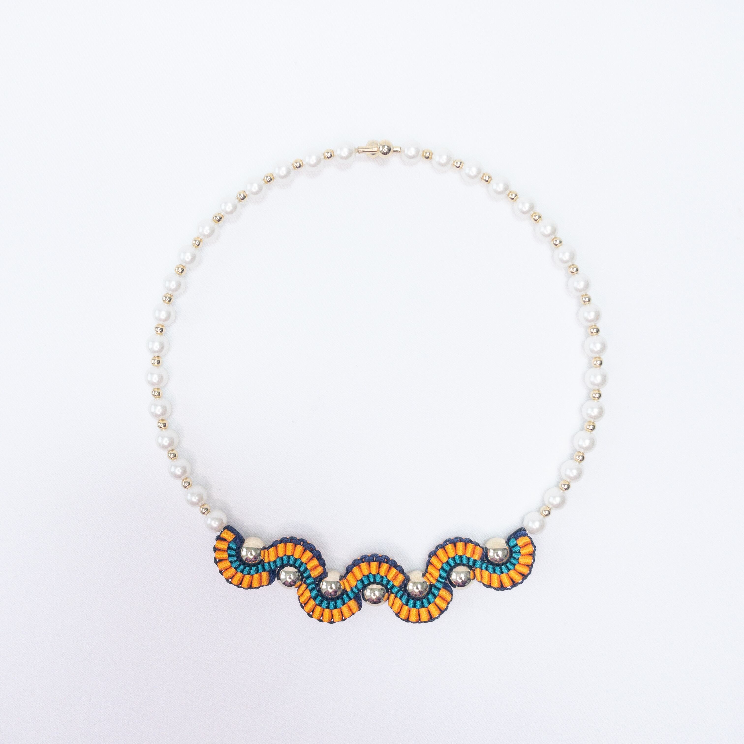 リボンを波のように巧みに編み込んだデザインが、シンプルでいて個性的なスタイルを演出してくれます。