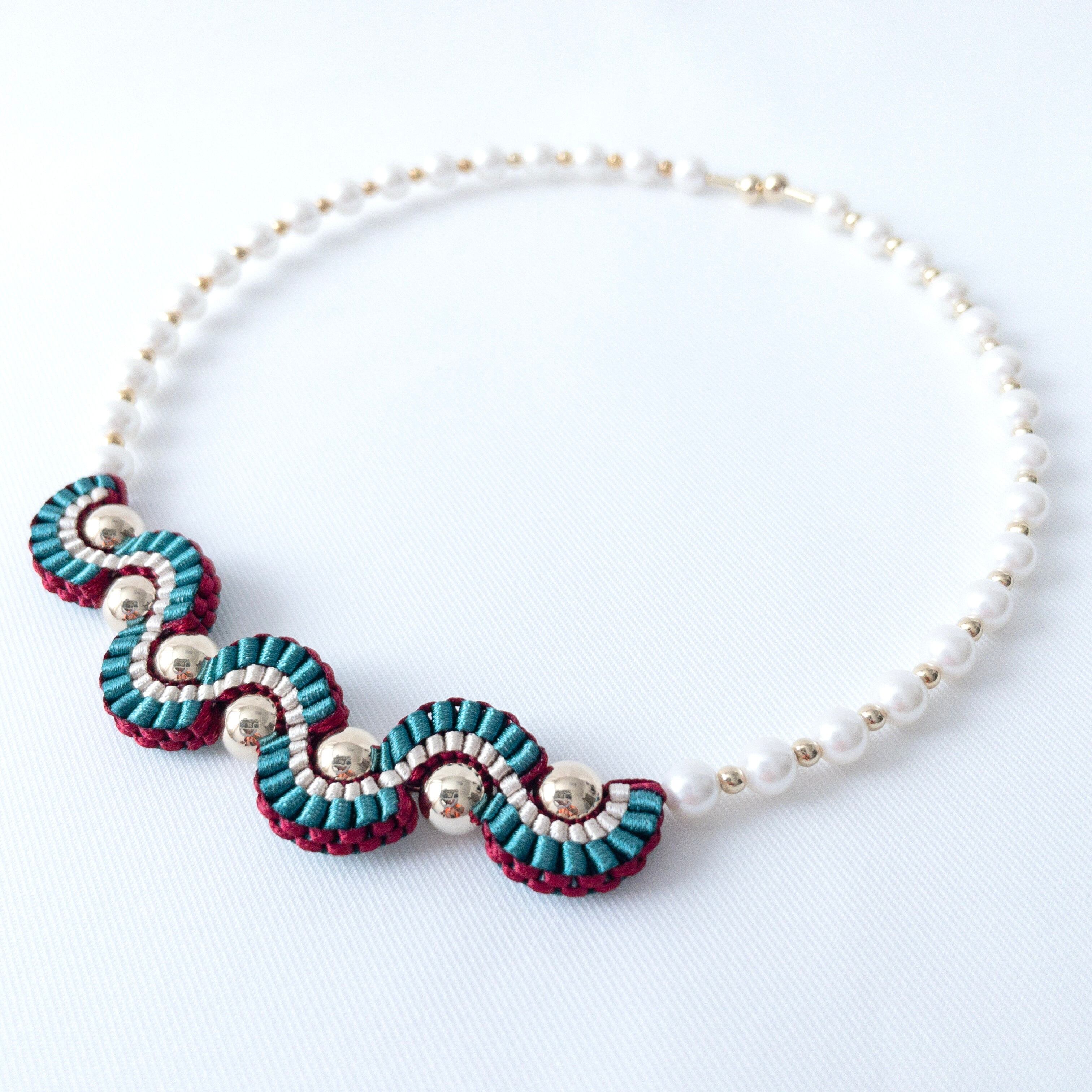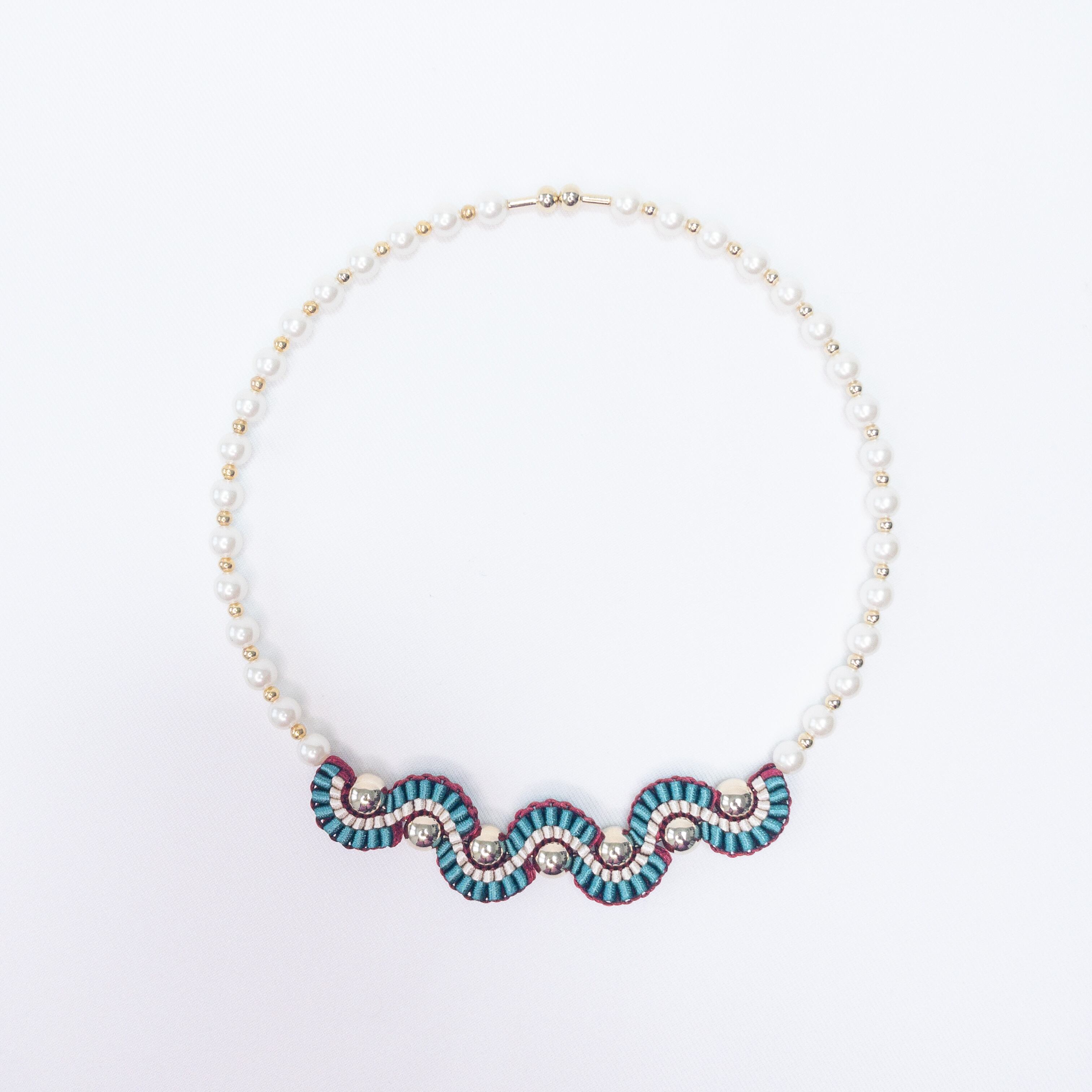 リボンを波のように巧みに編み込んだデザインが、シンプルでいて個性的なスタイルを演出してくれます。