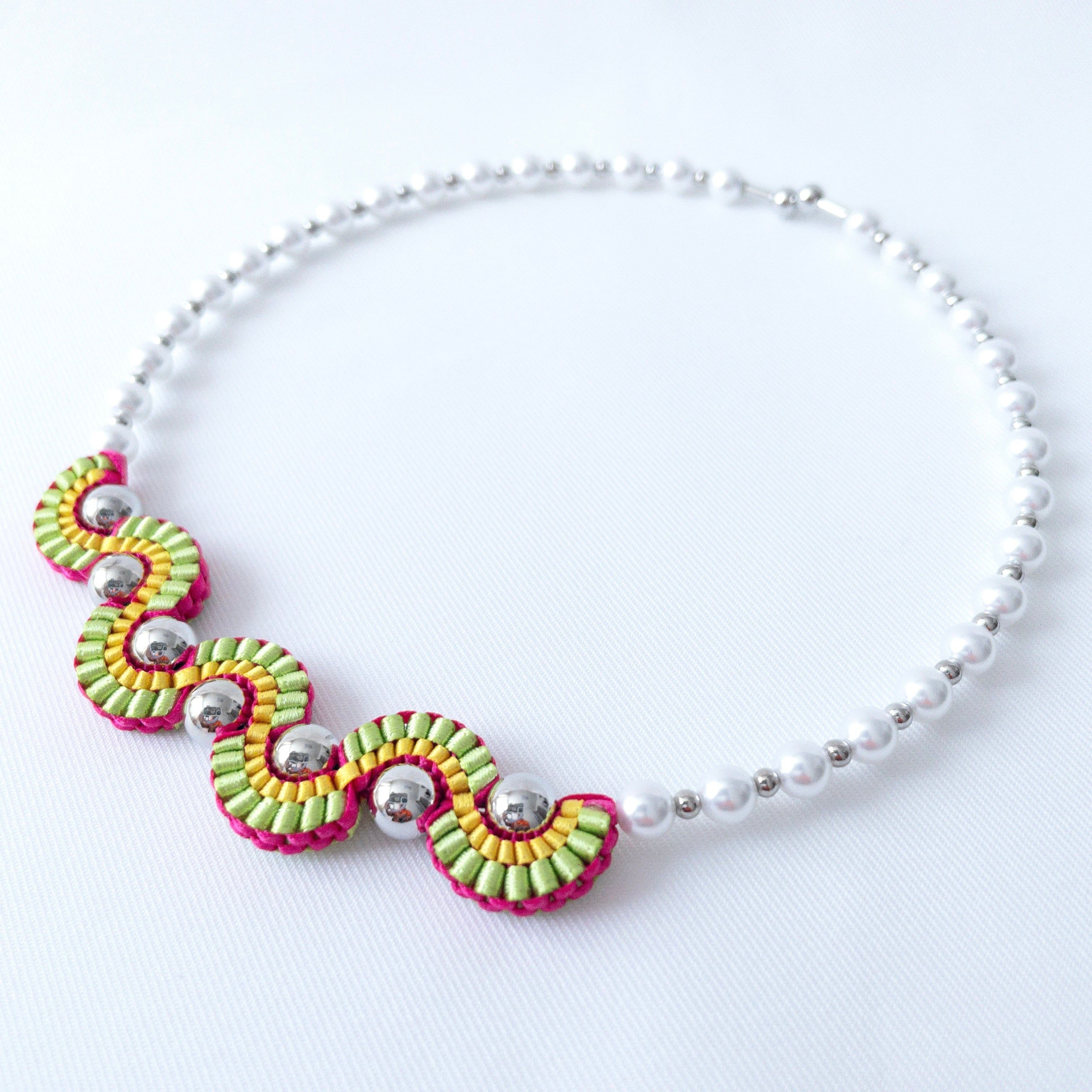 ダブルサテンリボン(ポリエステル)、銅玉( ABS樹脂)、プラスチックパール、ポリエステル糸