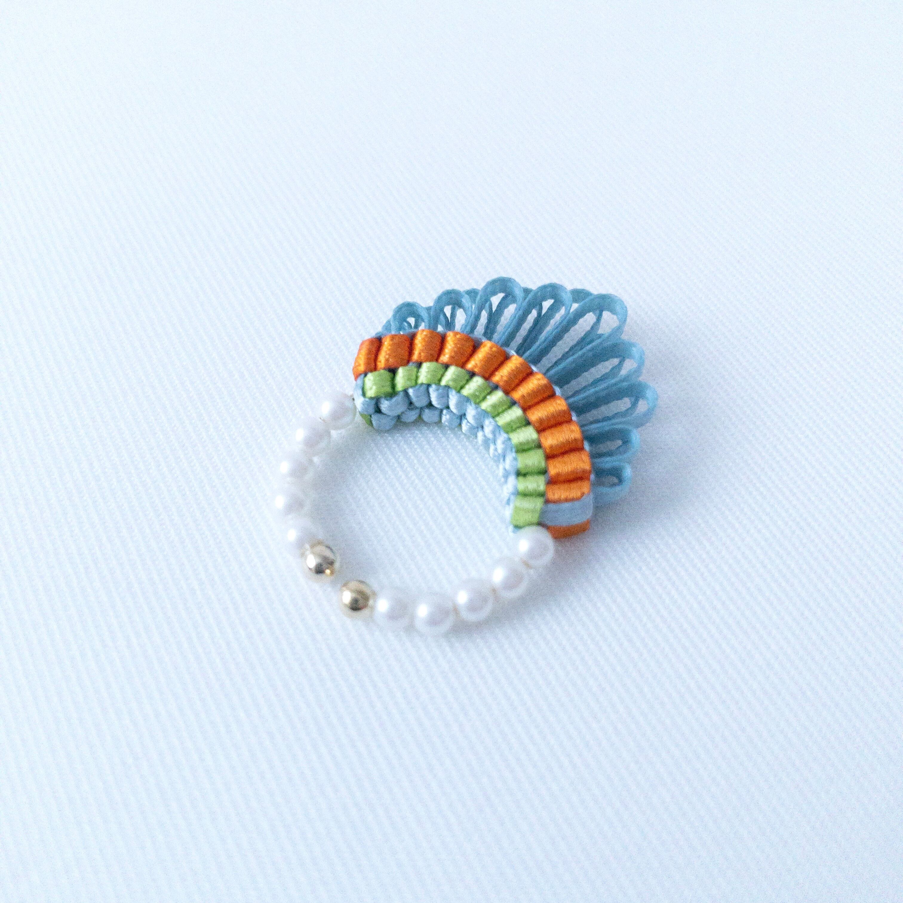 一段ずつリボンを編んでは引き出すという方法で、美しく扇状に広がるデザインに仕上げました。
