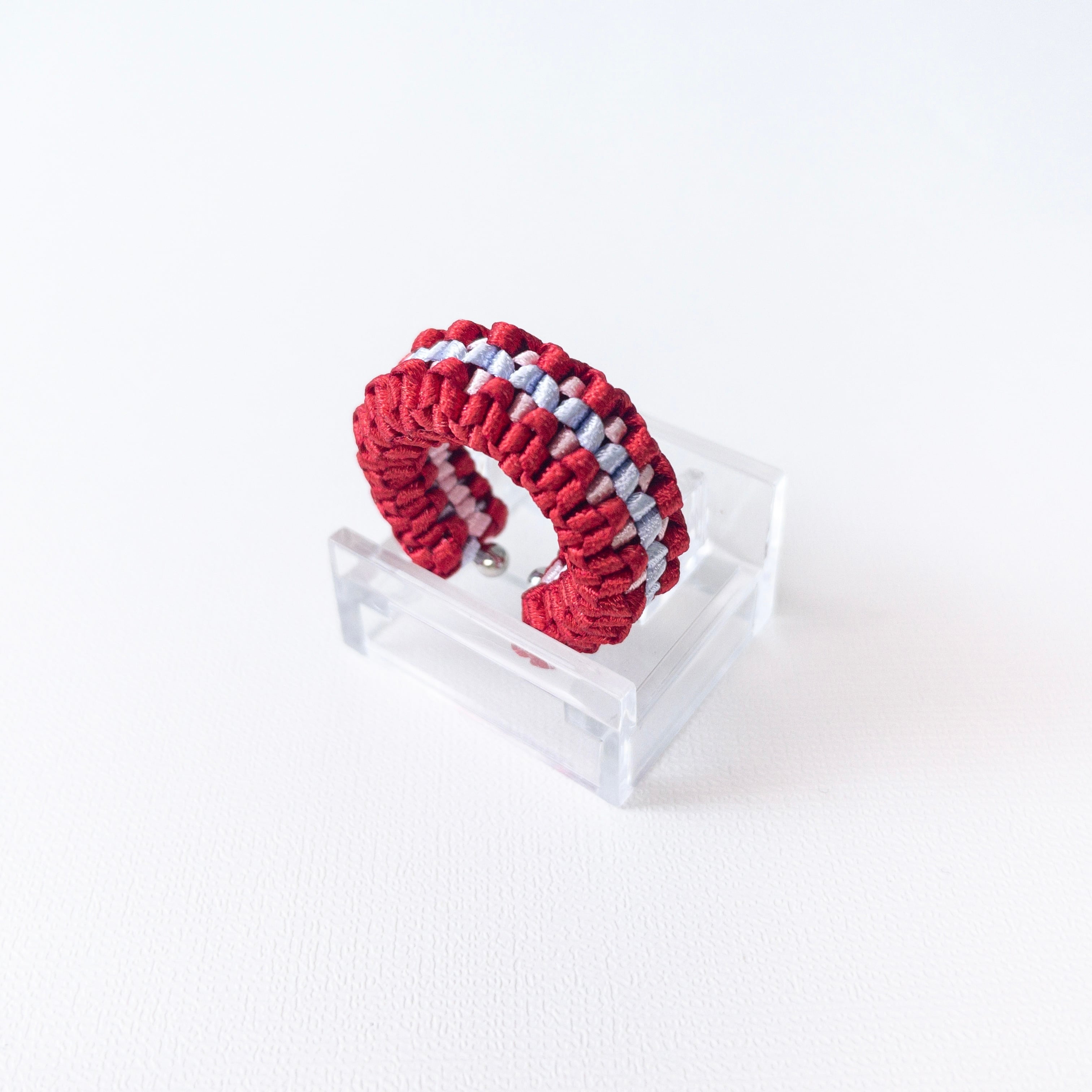 3色のリボンが丁寧に編み上げられており、どの角度から見ても美しさを際立たせます。